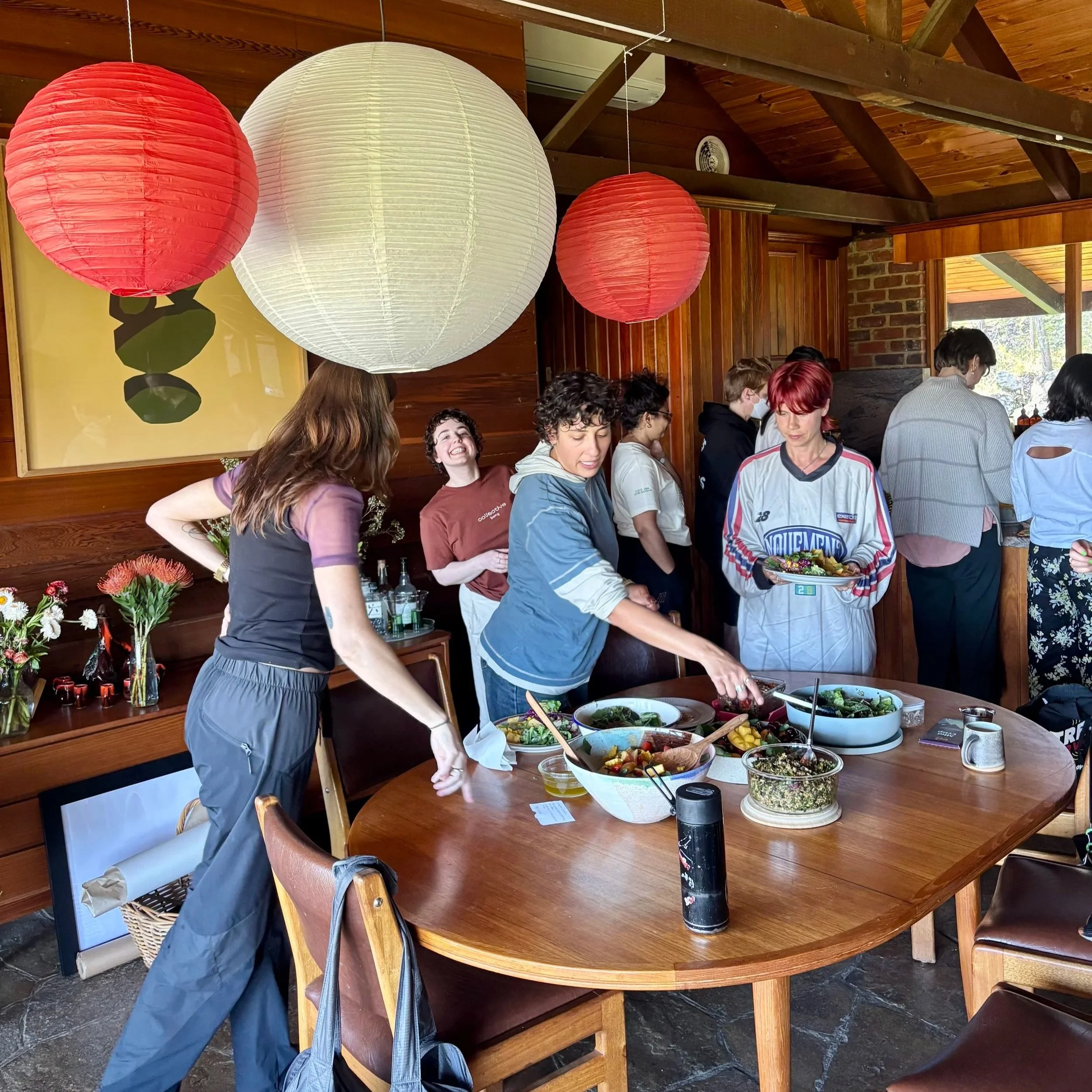 After a transitional somatic practice, we turned our attention to food. A homemade spud bar was curated, with salads and other touches. Handmade cards were scribbled in and shared. Dishes were stacked and washed, and tea was poured. A raw mango cheesecake appeared (thank you Irene), and disappeared very quickly.